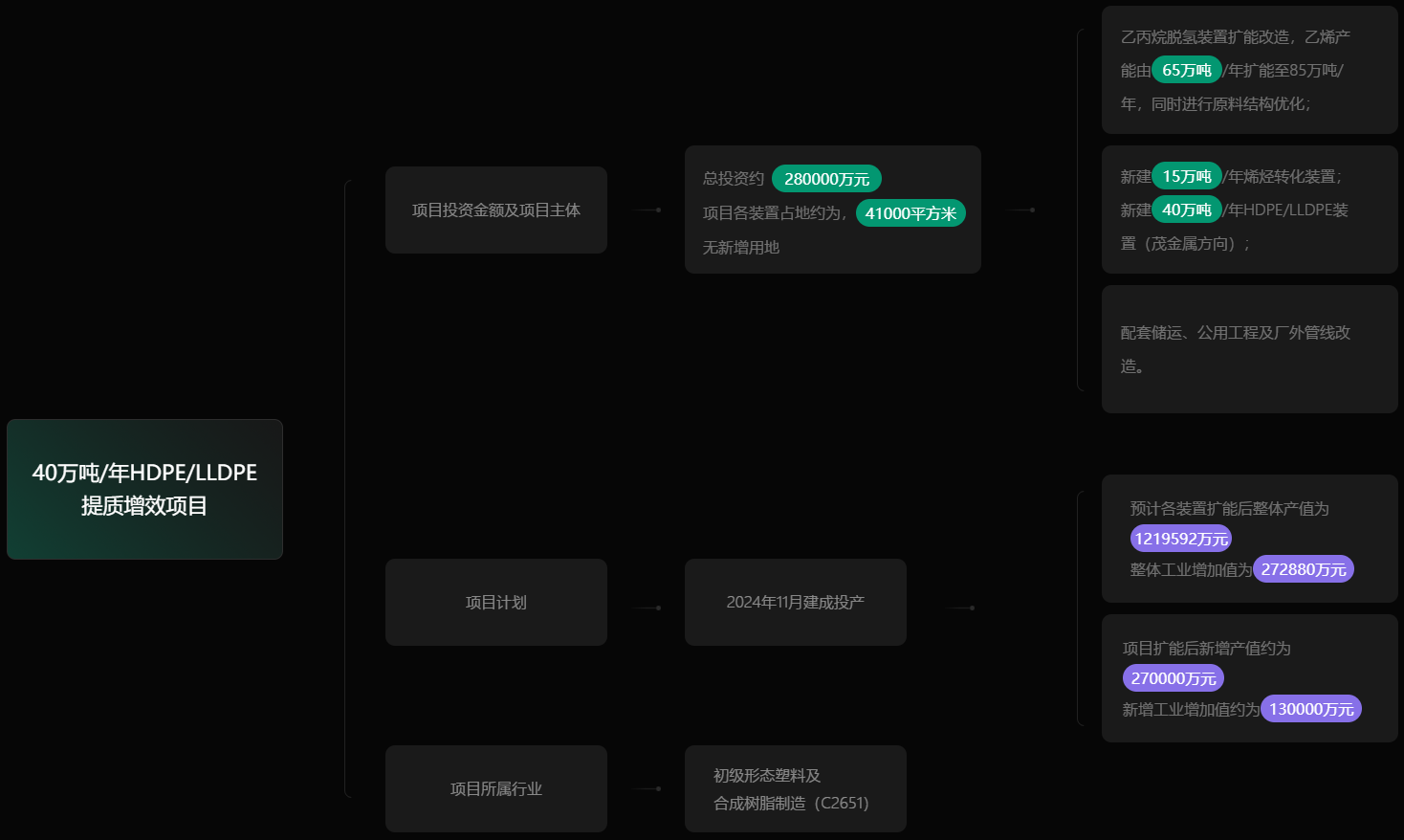 新增40万吨/年HDPE/LLDPE生产线并局部改造现有装置使总产能扩建至80万吨/年;